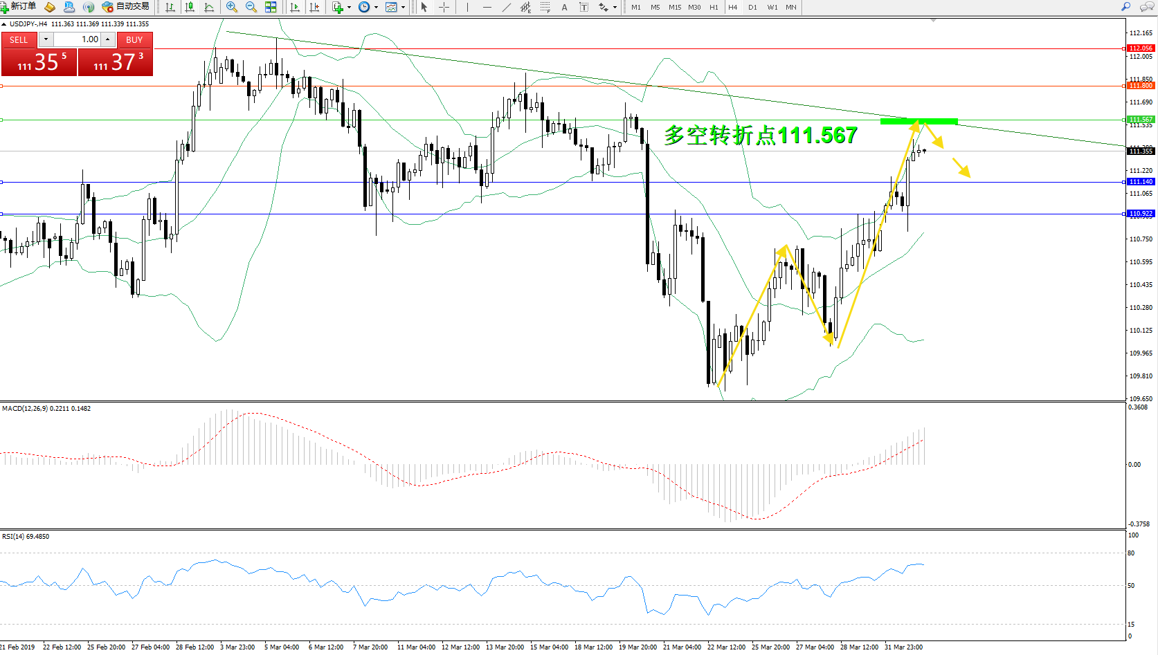 备选策略:111.567上方看涨,目标111.800、112.056
