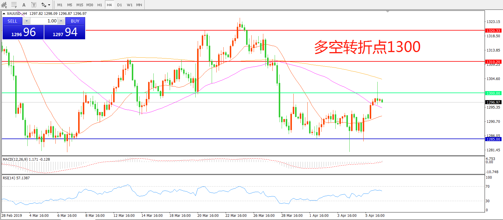 上周五非农强势带动美指上涨后,美元多头的获利盘渐渐涌现,从而推动美元回落。周一(4月8日)美市盘中,美元指数持续下挫,97关口失守,美国总统特朗普宣布将伊朗伊斯兰革命卫队列为恐怖组织加剧了市场情绪的担忧,金价一举突破1300美元/盎司大关,可惜但并未守住,最终收于1296.97美元/盎司
