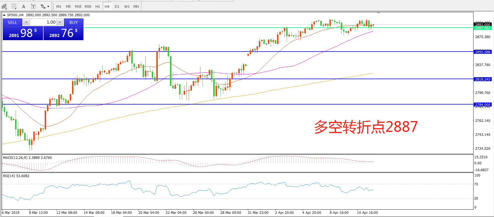 4小时图看,标普500延续震荡上行走势,21周期均线成为短期支撑, MACD红柱缩短,RSI指标向上,日内以震荡思路对待。