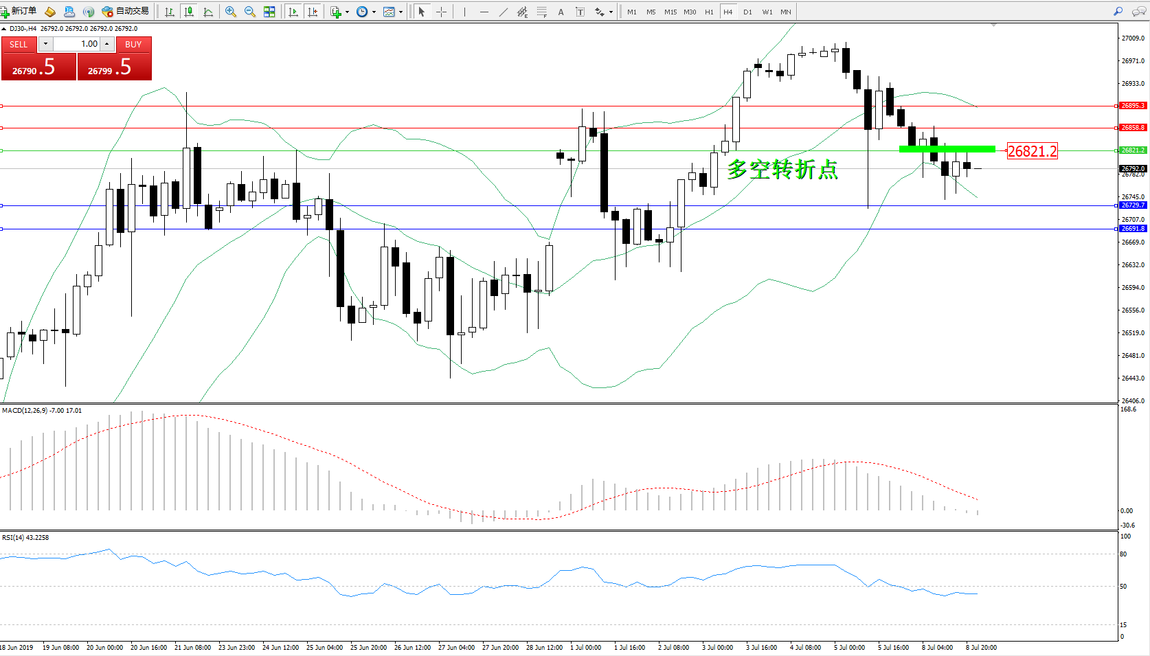 道琼斯指数7月8日(周一)收盘下跌116.00点,跌幅0.43%,报26806.14点。上周五(5日)公布的强劲6月非农就业数据不仅降低了市场对于美联储降息的预期,同时还为目前高涨的美股势头破了点冷水。市场预期美联储本月将降息25个基点,此前更是预期会降息50个基点,导致美国国债收益率周一度跌至2016年以来最低水平。