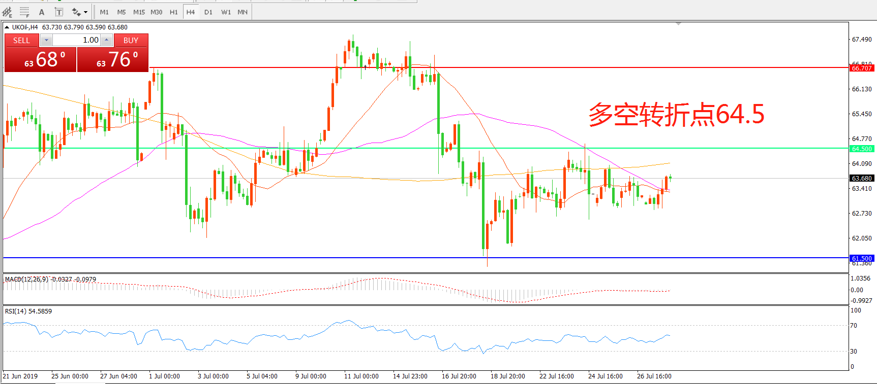 随着消费支出的增加,美国经济增长在第二季度放缓低于预期,但全球贸易的担忧情绪依然还在延续,中美代表团准备进行新一轮谈判令原油多头信心受到鼓舞,原油价格小幅攀升, 布伦特原油周一收涨0.2%,报63.68美元/桶。美联储议息会议前,市场观望氛围较浓。