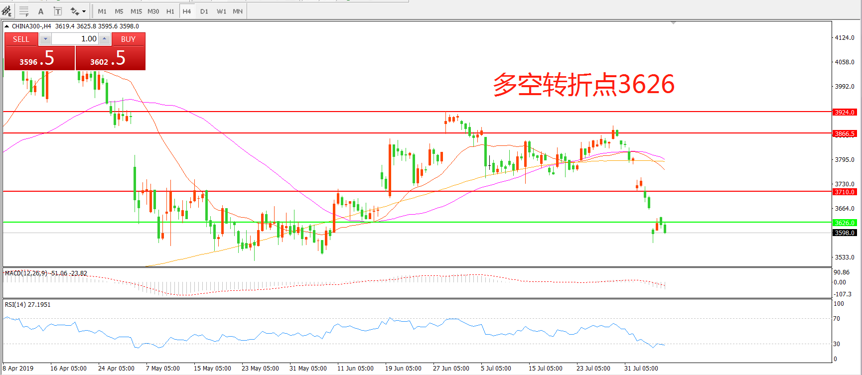 4小时图看,沪深300指数,跳空低开后延续下行,整体表现十分疲软,均线粘合形成上方阻力,日内延续下行概率较大