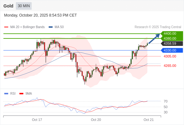 在 4330.00 之上,看涨,目标价位为 4380.00 ,然后为 4400.00 。