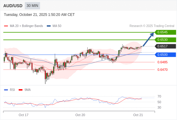 在 0.6500 之上,看涨,目标价位为 0.6530 ,然后为 0.6545 。