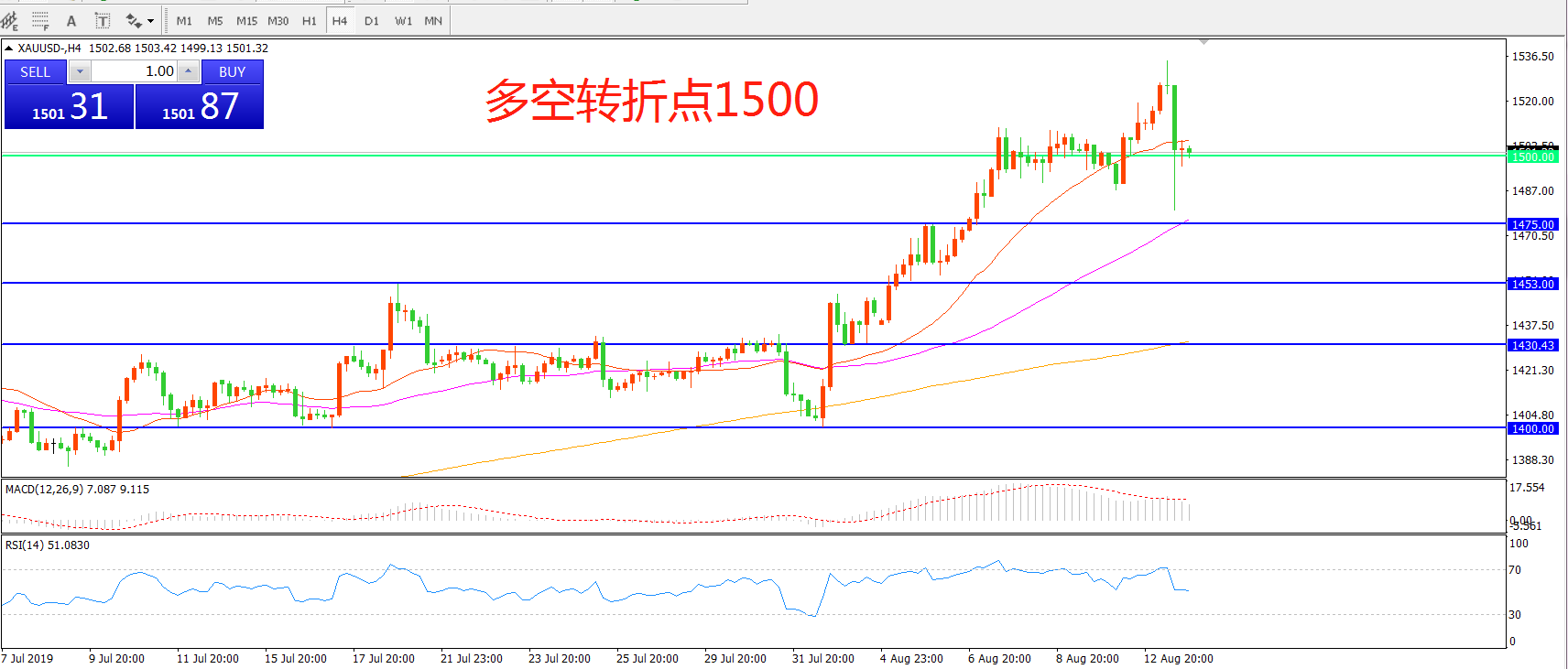 周二(8月13日),美国宣布将推迟对部分中国产品征收关税,并宣布双方同意继续进行贸易谈判。双方约定在未来两周内再次通话,金融市场瞬间掀起惊涛骇浪,现货黄金上演“高台跳水”,自日内高点跌去近50美元,最终收报1500.88美元/盎司。由于近期金价上涨过快,出现修正行情十分正常,中期走势依然看多。