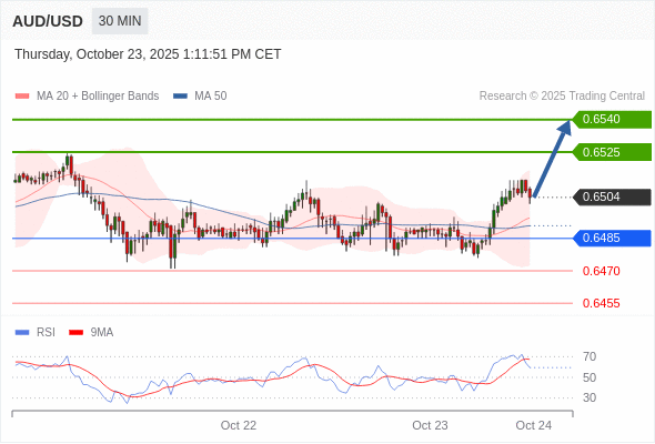 在 0.6485 之上,看涨,目标价位为 0.6525 ,然后为 0.6540 。