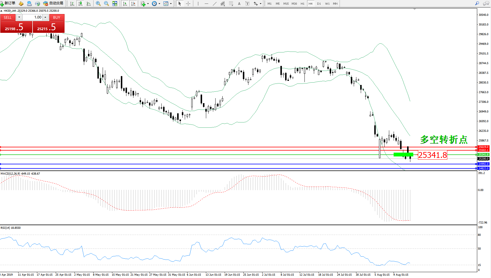 香港恒生指数8月14日(周三)收盘上涨20.98点,涨幅0.08%,报25302.28点;恒指夜期昨晚黄昏时候,曾急跌158点,低见25053。随后跟美股造好而反弹,再急升超过694点,全晚高低波幅852点,为近期少见。早上跟随高开后,再小幅向上,最多升436点,恒指高见25717。虽然隔晚贸易关系又似出现转机,但过去一年多以来相关情况已见惯见熟。而在内忧外患下,恒指下跌趋势实在所难免。市场应维持后市悲观看法不变。