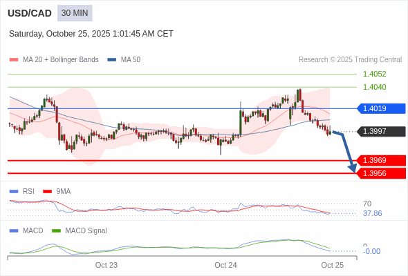 美元/加元 当日内 : 看跌,在 1.4019 之下。