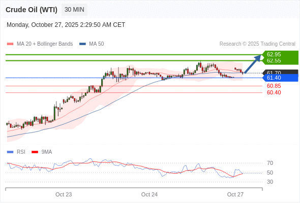 在 61.40 之上,看涨,目标价位为 62.55 ,然后为 62.95 。