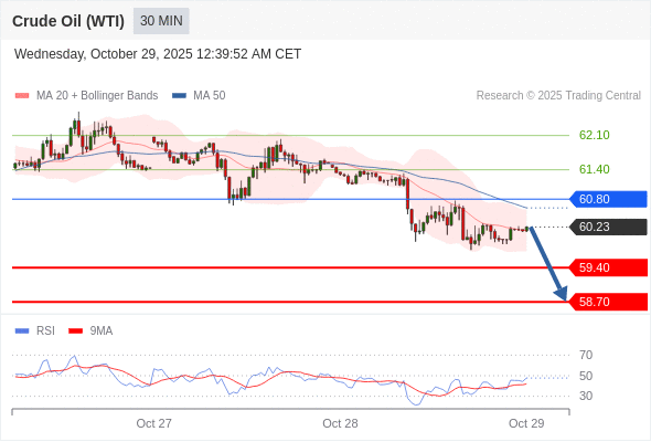 在 60.80 之下,看跌,目标价位为 59.40 ,然后为 58.70 。