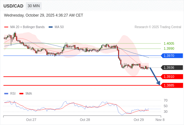 在 1.3970 之下,看跌,目标价位为 1.3910 ,然后为 1.3885 。