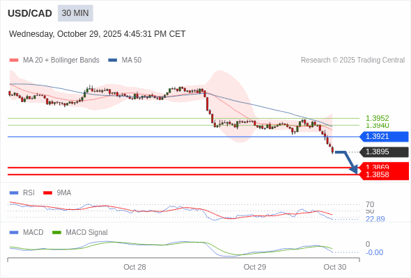 技术点评: RSI技术指标小于30。在这种情况下,说明有很强的下跌趋势,或者意味着处在超卖的状态下,可能会有向上的反弹。我们将观察RSI技术指标是否出现背离现象。 MACD技术指标处在其信号线之下看空。 配置为负。 此外,价位低于其20天及50天移动平均线 ( 分别位于1.3932 和1.3938 )。 最后,价位跌破其布林线通道下轨 (位于1.3903。