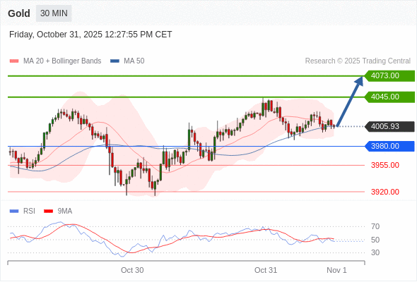 在 3980.00 之上,看涨,目标价位为 4045.00 ,然后为 4073.00 。
