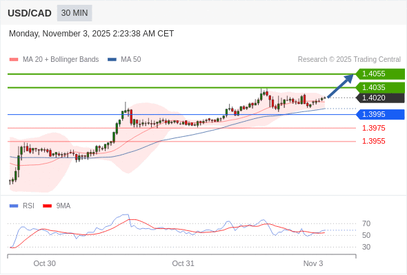 在 1.3995 之上,看涨,目标价位为 1.4035 ,然后为 1.4055 。