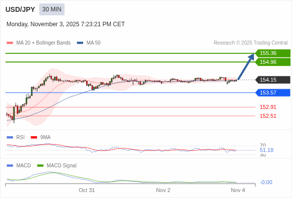 美元/日元 当日内 : 调整至 153.57 处,在反弹上升之前。