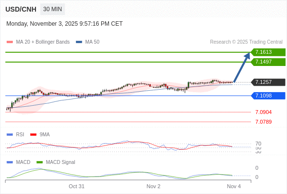 美元/人民币 当日内: 看涨,当 7.1098 为支撑位,目标定在7.1613。