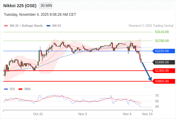 在 52220.00 之下,看跌,目标价位为 51300.00 ,然后为 50800.00 。