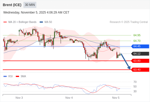 在 64.45 之下,看跌,目标价位为 63.80 ,然后为 63.40 。