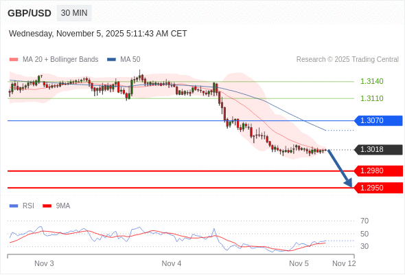 在 1.3070 之下,看跌,目标价位为 1.2980 ,然后为 1.2950 。