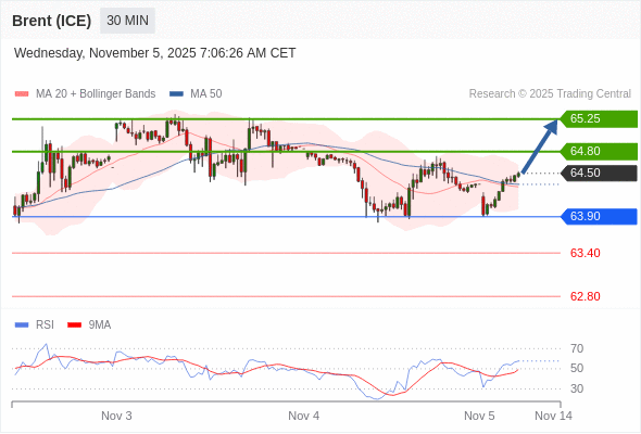 在 63.90 之上,看涨,目标价位为 64.80 ,然后为 65.25 。