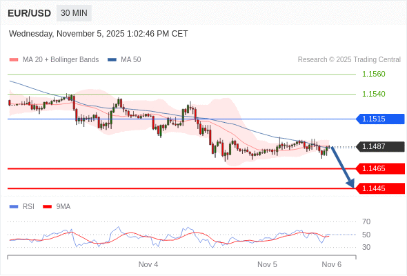 在 1.1515 之下,看跌,目标价位为 1.1465 ,然后为 1.1445 。