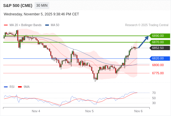 交易策略: 在 6820.00 之上,看涨,目标价位为 6870.00 ,然后为 6890.00 。
