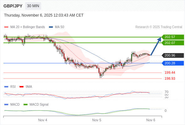 英镑/日元 当日内: 看涨,当 200.28 为支撑位,目标定在202.57。