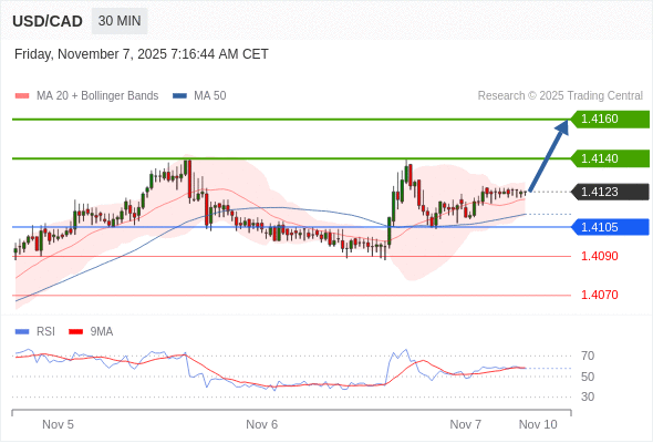 在 1.4105 之上,看涨,目标价位为 1.4140 ,然后为 1.4160 。