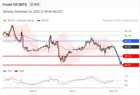 在 60.15 之下,看跌,目标价位为 59.30 ,然后为 58.80 。