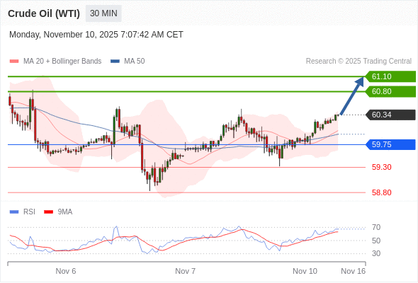 在 59.75 之上,看涨,目标价位为 60.80 ,然后为 61.10 。