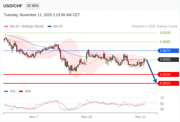在 0.8070 之下,看跌,目标价位为 0.8030 ,然后为 0.8015 。