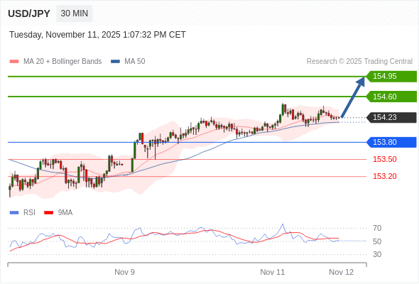 在 153.80 之上,看涨,目标价位为 154.60 ,然后为 154.95 。