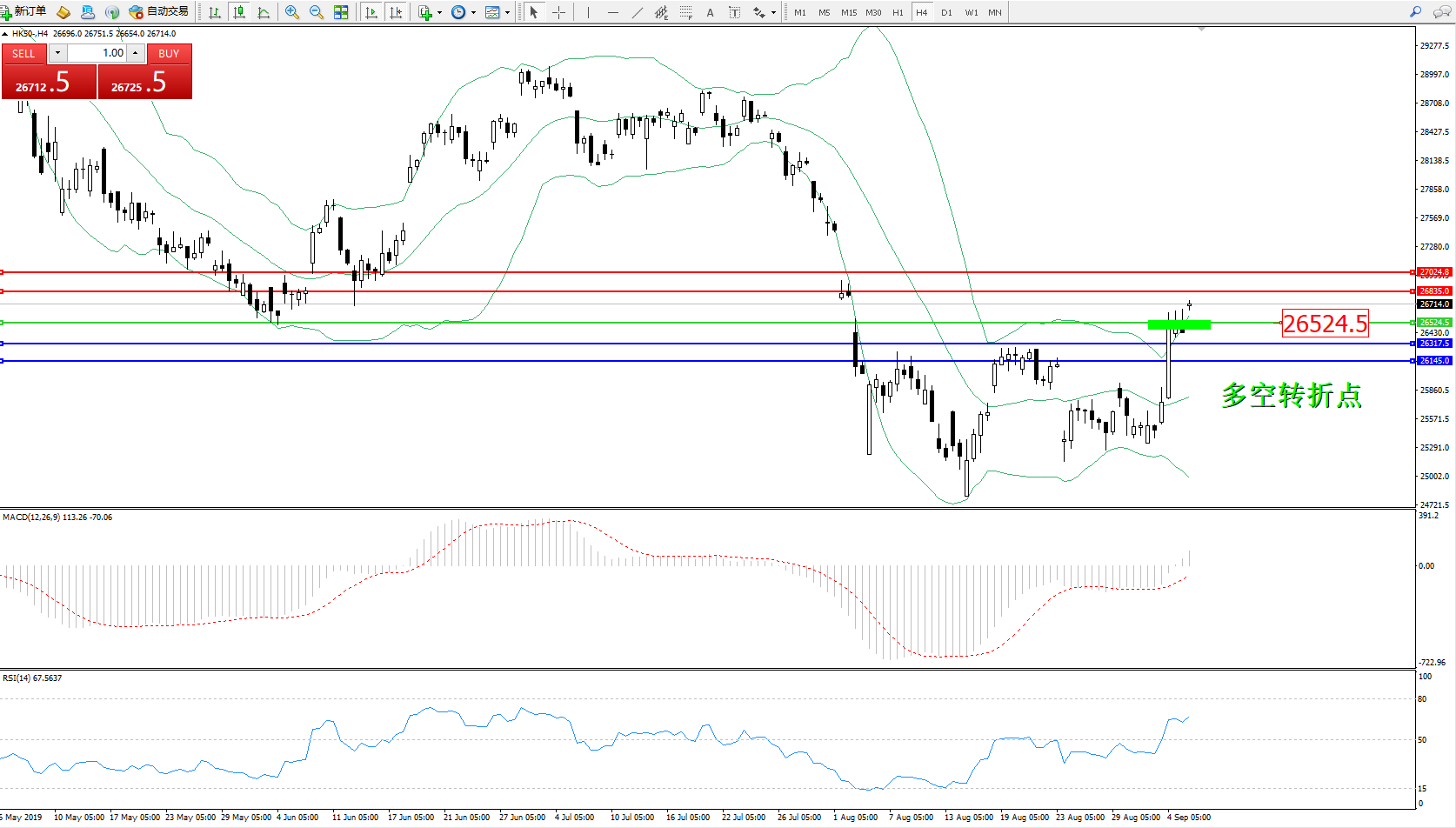 香港恒生指数95日(周四)收盘下跌7.70点,跌幅0.03%,报26515.53点;市场气氛好转,港股今早低开后再转升,升幅之后不断扩大,曾见26697点,涨174点。信诚联席董事表示,由于A股急升带动港股走高,而且近来多间大型公司作回购动作,令市埸认为股市已大致见低,投资者信心亦开始渐增。他又指,上日港股升逾千点后,今早未见回落,可见后市有力企稳二万六关,若央行进一步降准,港股更有望突破五十天线(约27200点)。