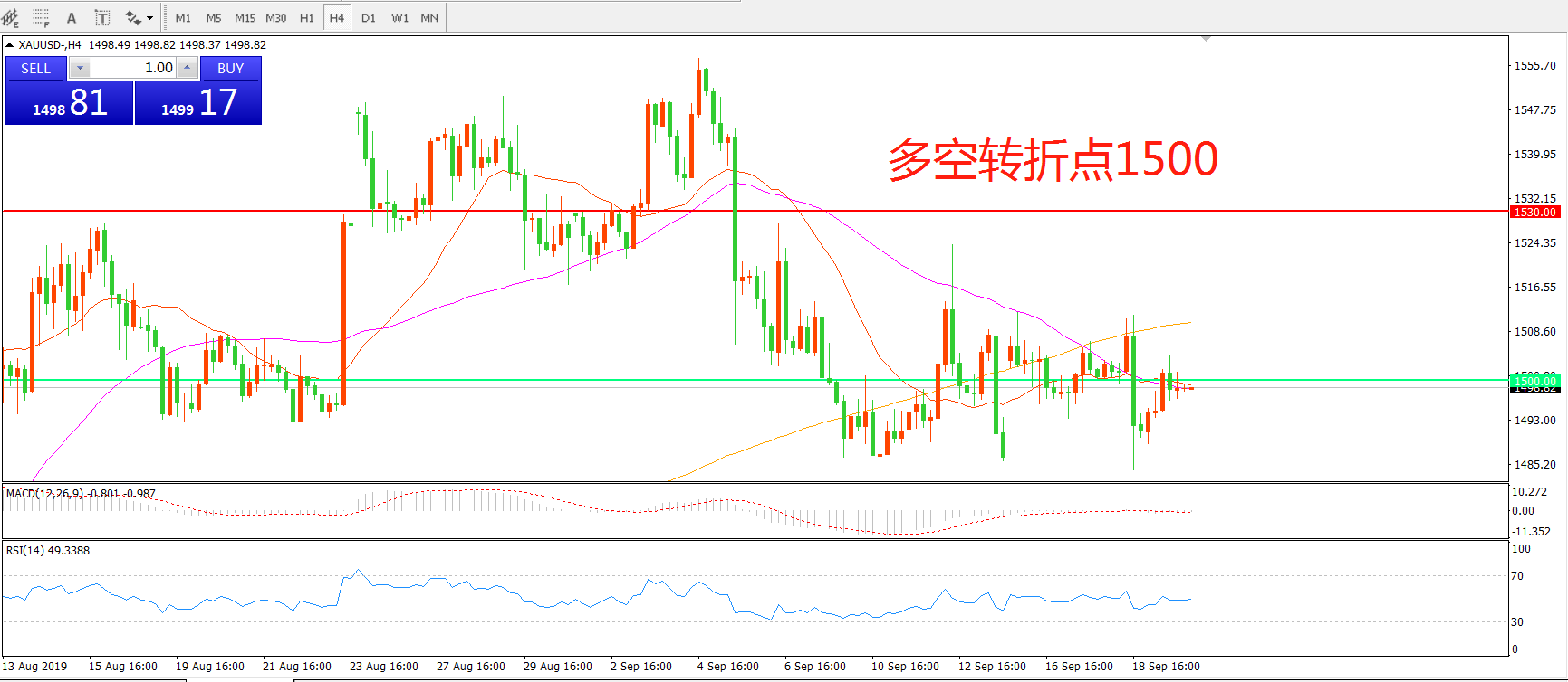 北京时间周四(9月19日)金价在经历了昨日的大幅震荡后有所企稳,一路上行但触及高位后回落,最终收报1498.80美元/盎司。因美元走软以及在美联储周三暗示进一步放宽货币政策的门槛提高后,经济放缓和持续贸易争端的前景盖过了对美联储决策者利率分歧的担忧,目前市场情绪比较混乱,投资者急需从其他方面明确的美国利率前景线索。