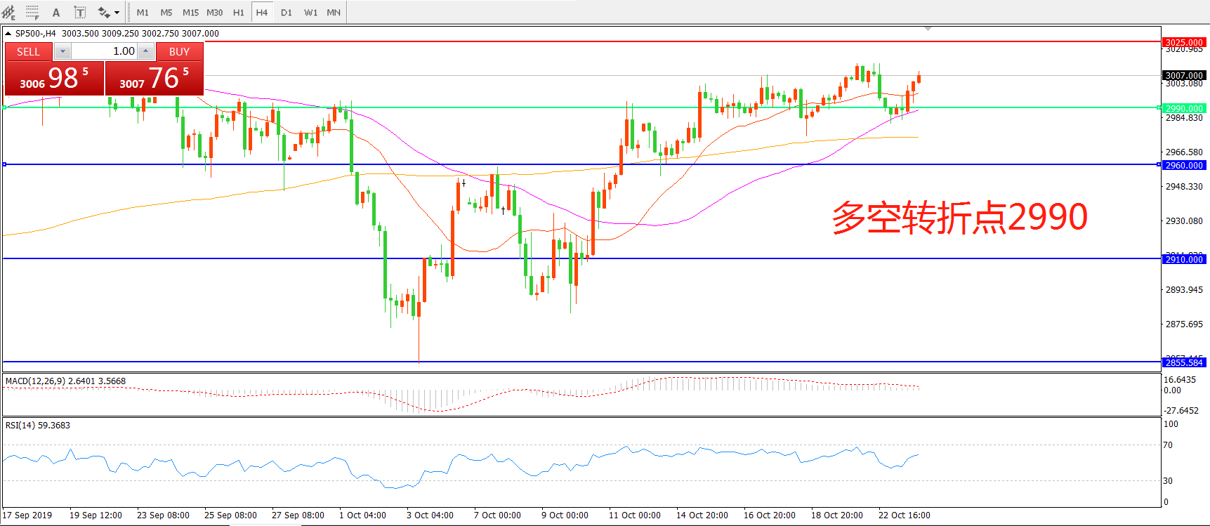 4小时图看,标普500震荡反弹,回踩2990支撑后再回3000大关,整体走势仍然偏强,MACD红柱减少,RSI指标向上,日内延续上行概率较大。