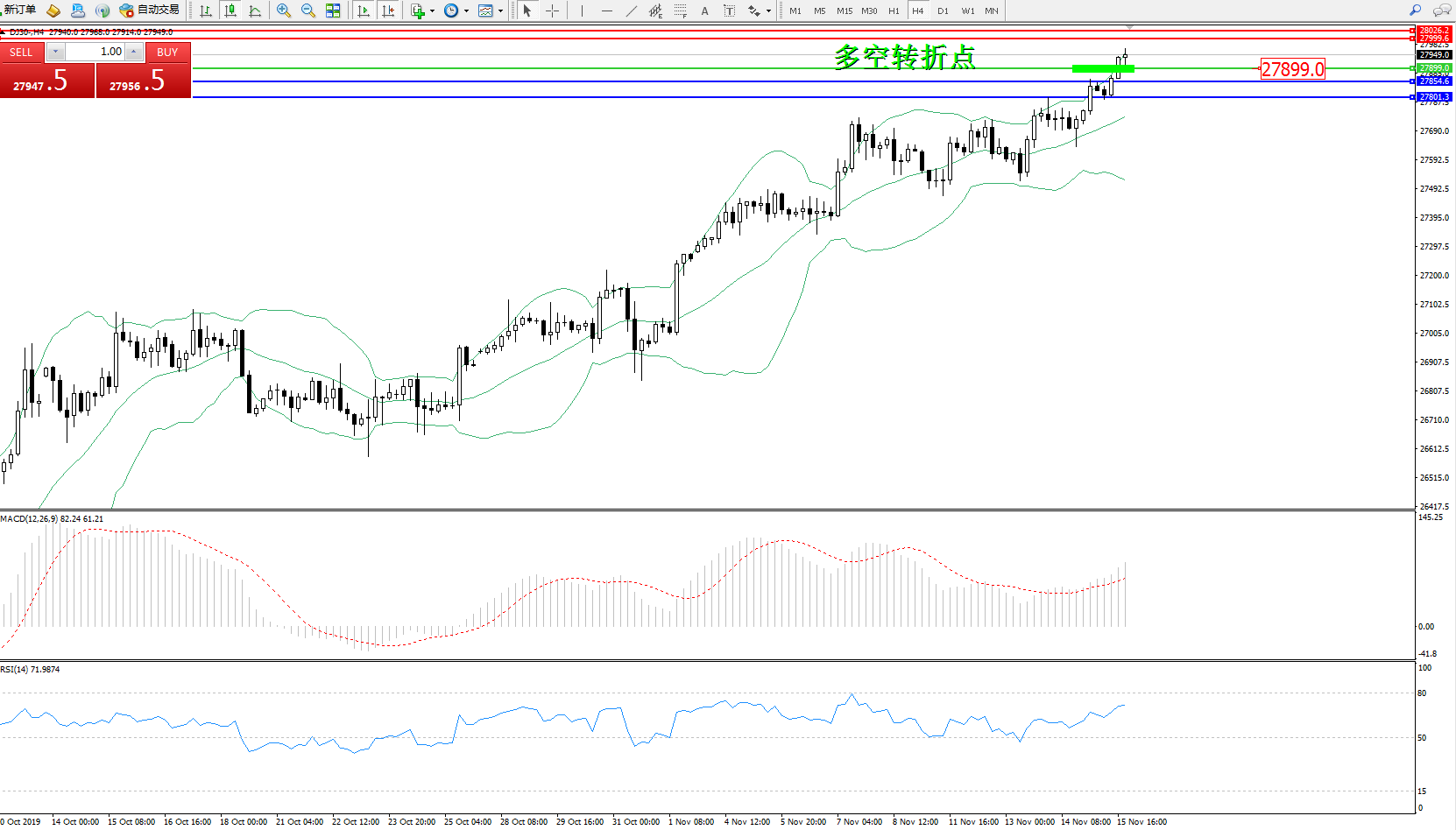 道琼斯指数11月15日(周五)收盘上涨222.70点,涨幅0.80%,报28004.69点。史上首次突破28000点里程碑。关于贸易协议进展的官员讲话提振了市场情绪。市场对第一阶段协议获得批准的最后阶段非常乐观。这一直是全球经济最大的逆风,而冲突得到重大缓解,投资者同时还在关注美国零售销售等多项经济数据。
