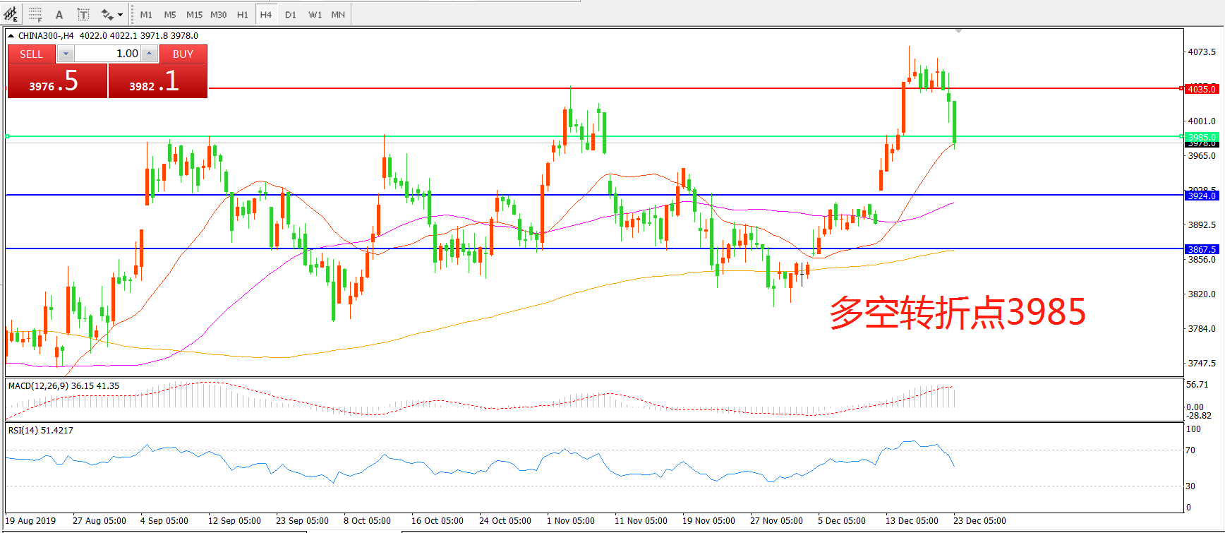 周一(12月23日),A股在高位上攻无力之后,出现回调,博弈类资金获利了结导致股市大跌,沪深300指数长阴下破,收报3976.5点。整体来看,除了早盘开始后稍加抵抗外,其他的交易时间均以持续下跌走势为主,市场的杀跌比较凶悍。3000大关的阻力依然较强,如果如果2-3个交易日能收复,则强势格局不变,如果连续失守,短期仍将转入调整走势