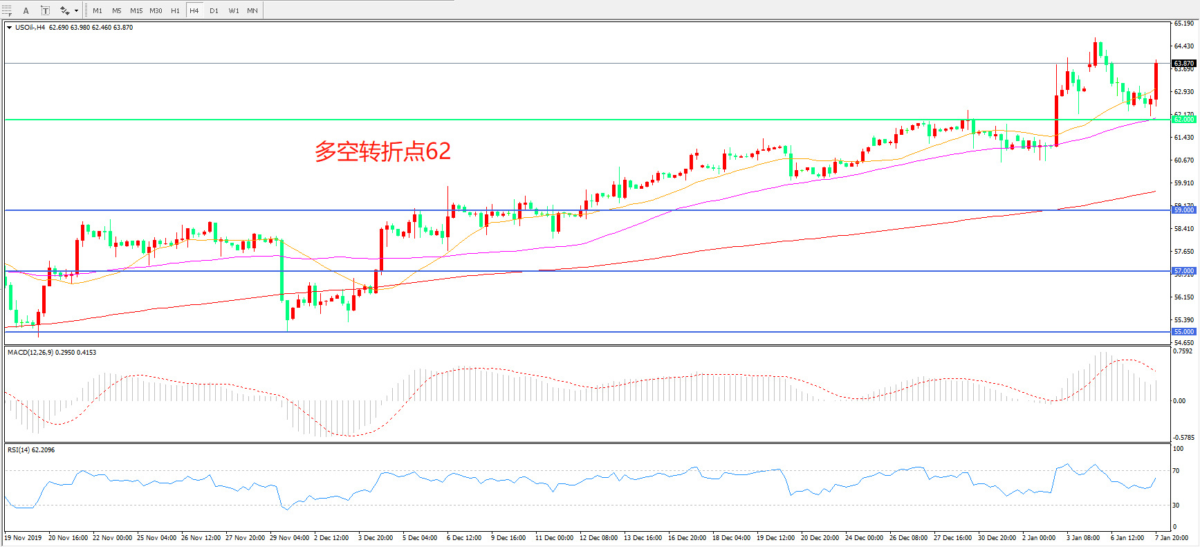 周三 (1月8日),有市场消息称六枚导弹落入位于伊拉克阿萨德的美军基地,美油快速走高,截止发稿前收报63.87美元/桶,此前伊朗最高国家安全委员会主席周二表示,伊朗正在对13种报复美国的备选方案进行情境评估,以回敬美国击杀伊朗名将苏莱曼尼的恶行。