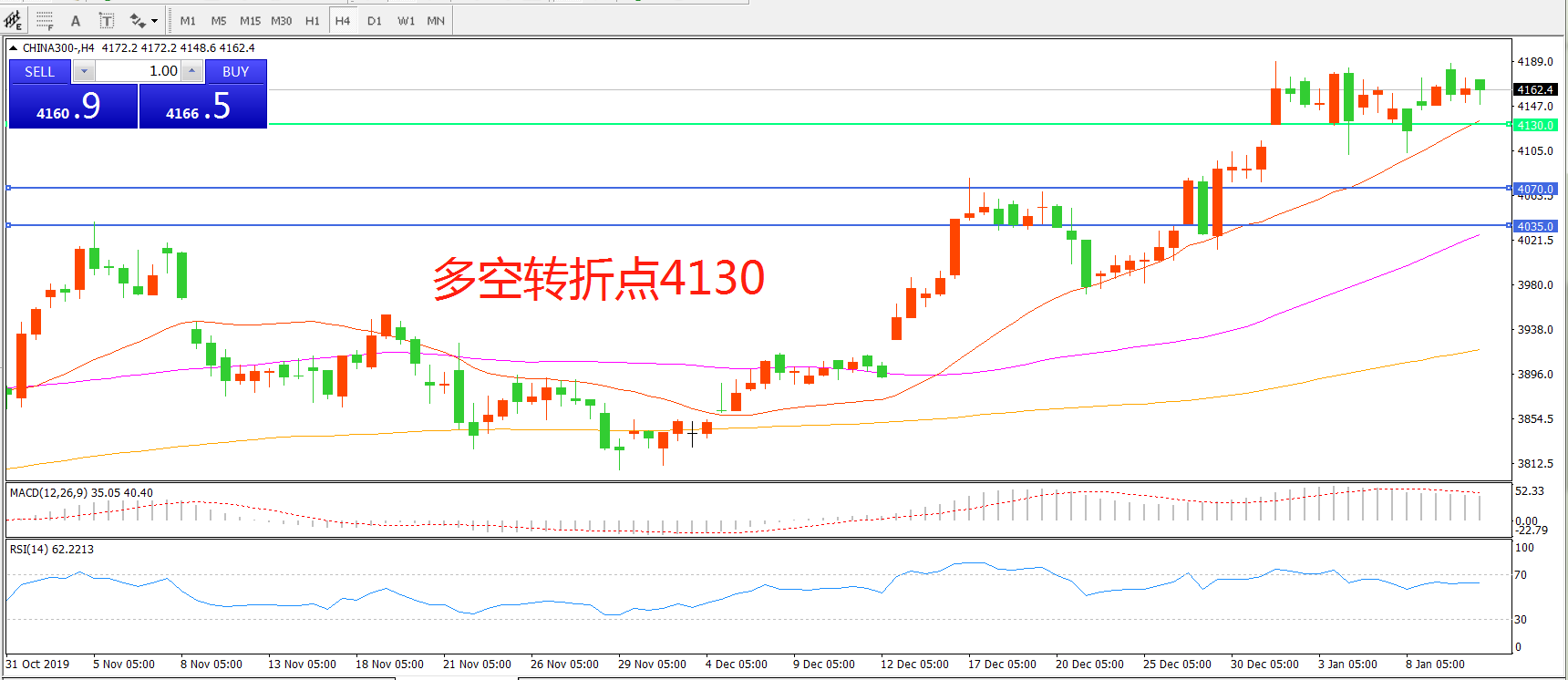4小时图看, 沪深300延续高位震荡,4130一线再度被收复, 均线系统呈多头排列,MACD红柱缩短,RSI指标向上,日内震荡上行概率较大。