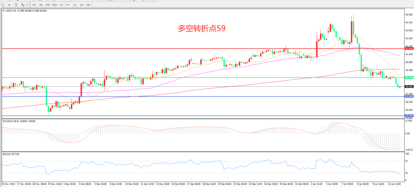 交易策略: 在59.00之下看跌,目标57.00       55.00