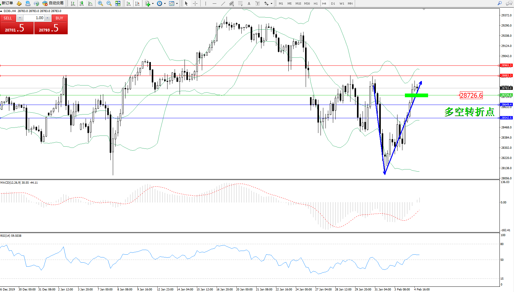 道琼斯指数2月4日(周二)收盘上涨407.80点,涨幅1.44%,报28807.63点。市场对新冠病毒疫情的担忧有所退散,美股高开高走,道指盘中一度涨超500点,美国股市创去年8月以来的最大涨幅,随着投资者在上周的暴跌后重返风险资产,看涨人士将重点放在强劲的公司业绩和中央银行所提供的支持上。同时,随着2020年民主党总统候选人角逐开始,交易员在等待艾奥瓦州党团投票结果。全球股市,尤其是美国市场的戏剧性走势,清楚地表明对全球公共卫生事件削弱GDP增长的担忧减轻,我们对避险资产的需求也减少。