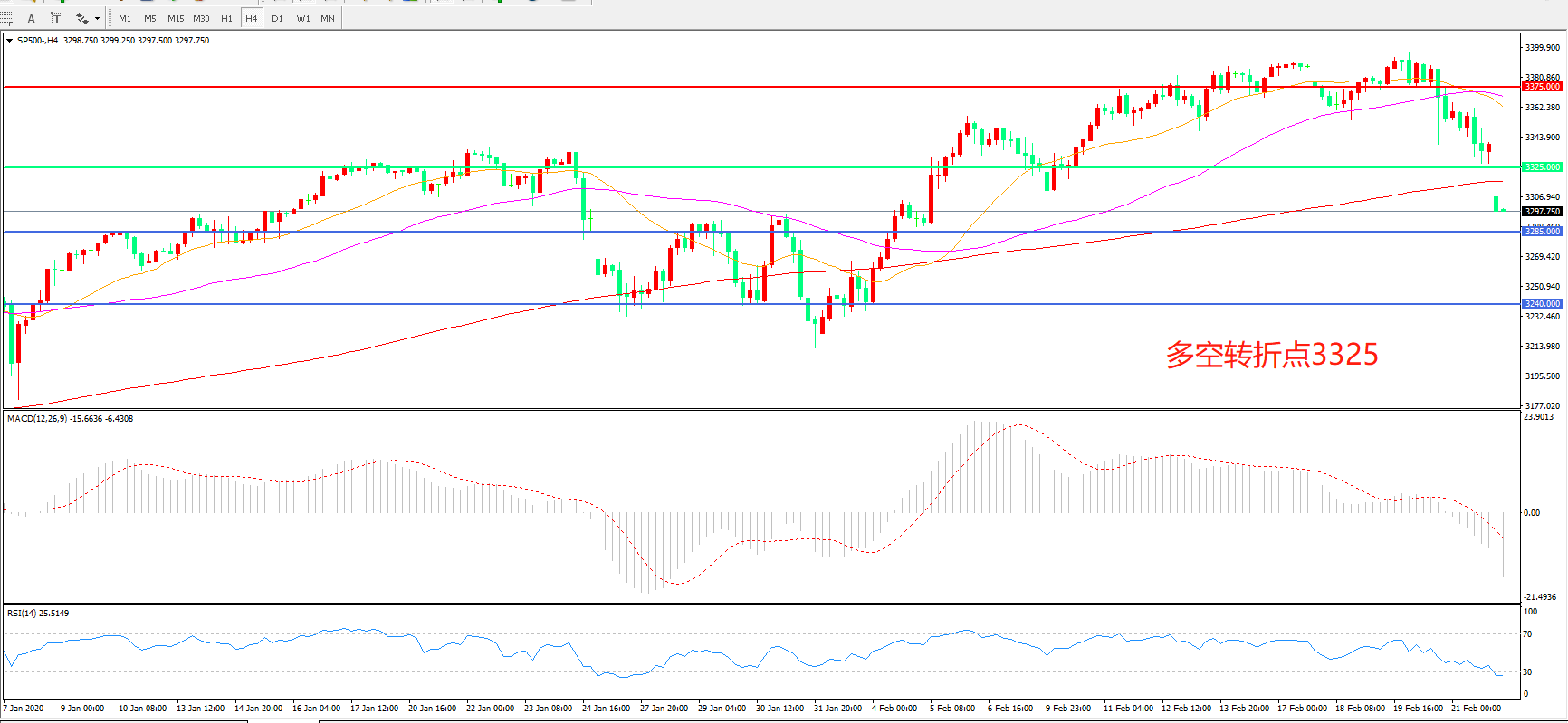 上周五(2月21日),最新发布的美国2月Markit PMI初值不及预期, 2月美国商业活动经历金融危机以来首次收缩,标普创下1月底以来最差的单日表现,今日早盘,风险资产继续遭抛售,标普500低开低走,截止发稿前收报3297.50点。