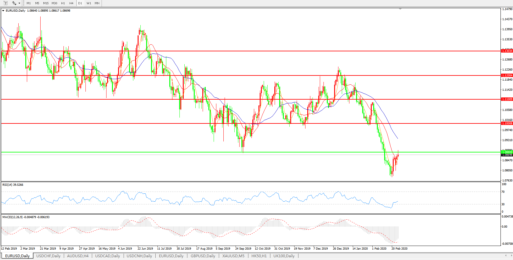 欧元兑美元在周二进入欧洲时段后再度陷于颓势,汇价回吐日内稍早涨幅跌至日低1.0830,因美元指数在避险情绪重新升温的推动下再度走势,而欧元区自身则在公共卫生风险事件的冲击下陷入困境;作为亚太地区之外受公共卫生突发事件波及最深的国家,意大利方面周二继续传出局势严峻的信号,当地政府不得不取消了更多公众活动,而这让周边欧元区国家也感到如临大敌,这重新加剧了欧元的颓势。市场担心,在欧洲经济本已脆弱且受到外部供应链危机冲击的背景下,其本土发生的风险事件料令经济前景雪上加霜。这也意味着欧洲兑美元的下行趋势并未得到遏止,后市仍有续跌空间,1.08关口仍然持续受到威胁。虽然,美元指数在100关口持续遇阻的状况或许会对欧元有支撑,但这难以根本上改变欧元汇价的下行趋势。