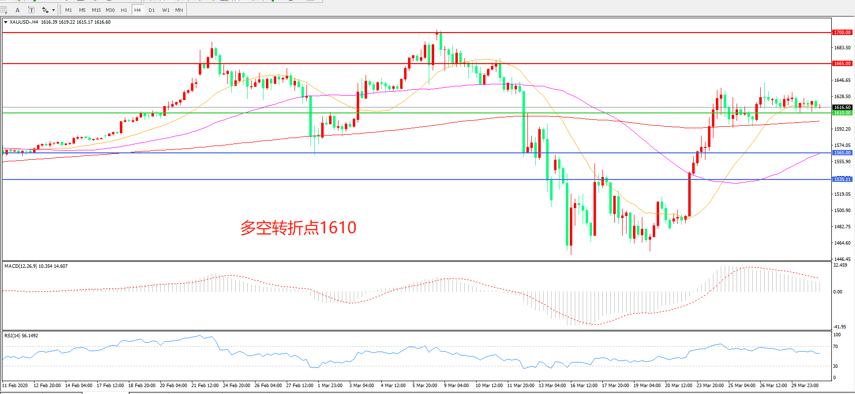 这周的重磅大戏无疑就是非农就业数据的亮相,上周公布的初请失业金人数328万,创下历史之最,非农就业数据预计将会更加糟糕,随着经济衰退的逐步递进,避险性的货币会慢慢进入人们的视野。值得警惕的是俄罗斯中央银行周一宣布,将从4月1日开始停止购买黄金,但没有解释此举缘由,近年来俄罗斯大量购买黄金,一直是支撑市场的主要支柱,在投资者抛弃避险资产、转投高风险高收益率资产的时候支撑了金价。
