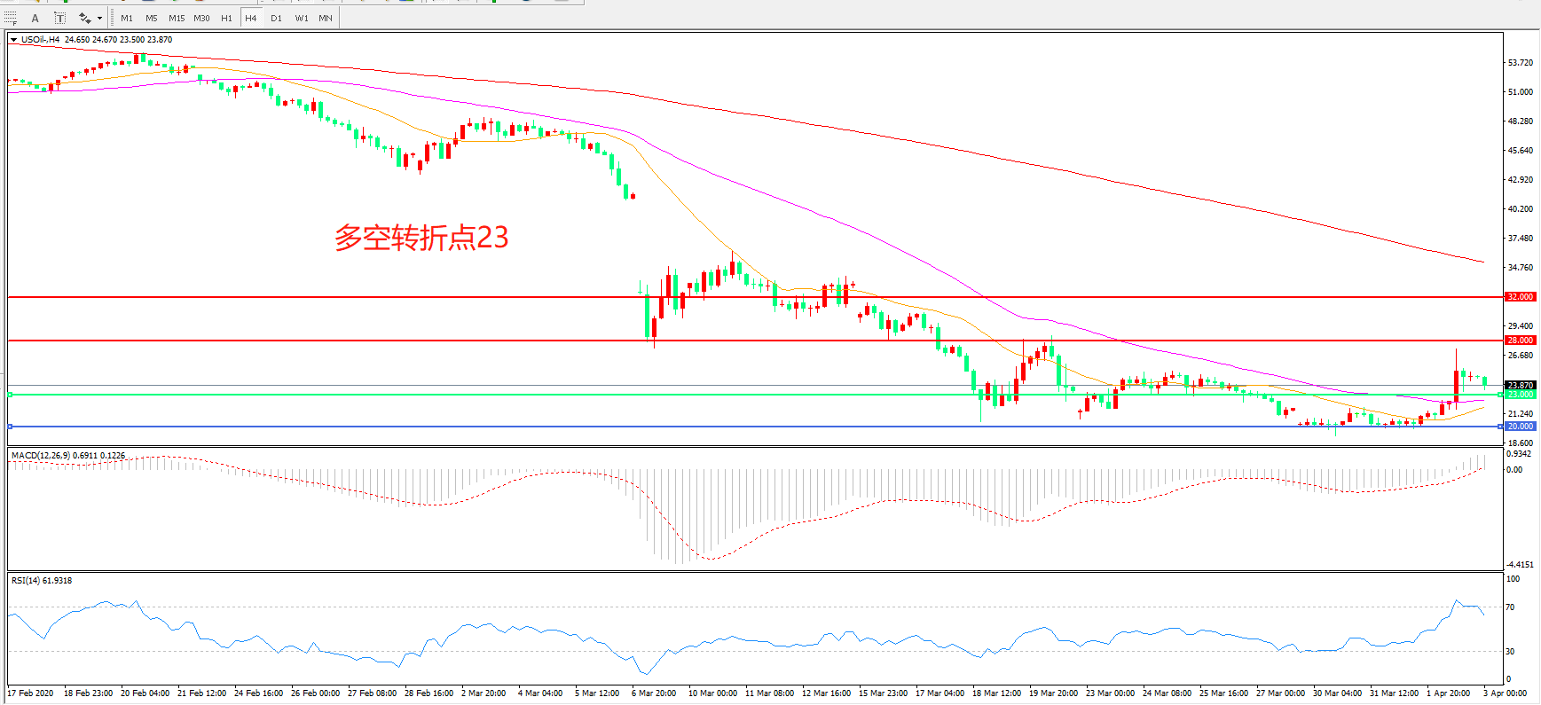 4小时图看,美油长阳拉升,突破前期整理区间,整体走势有所回暖,23美元成为短期支撑,短期均线走平,MACD红柱增加,RSI指标走平,日内延续上行概率较大。