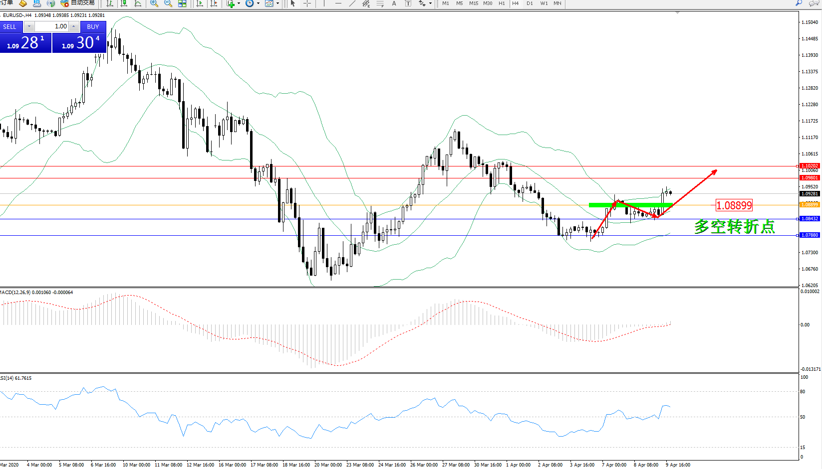 交易策略:1.08899上方看涨,目标1.09801、1.10202