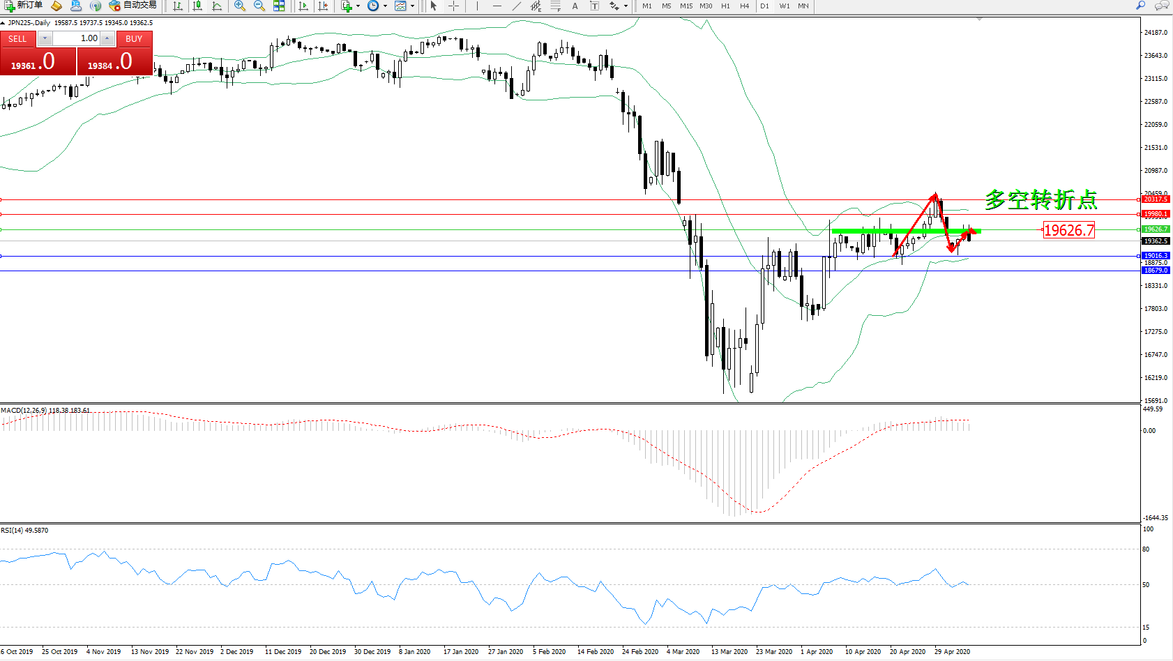 日经225指数51日(周五)收盘下跌566.19点,跌幅2.80%,报19627.50点。日内亚洲股市纷纷大跌,新冠肺炎疫情对全球经济的影响开始显现,近期公布的企业财报也令投资者失望,日本4月制造业PMI终值萎缩速度为11年以来最快,而日本首相安倍晋三计划延长紧急状态,摩根大通下调日本第二季度GDP增速预期。目前,摩根大通预计日本第二季度GDP年化季率萎缩42%,较此前预期进一步下调7个百分点。预计日本第三季度经济或将基本恢复正常,但即便至今年年底,经济活动也不太可能恢复到疫情大流行前水平。