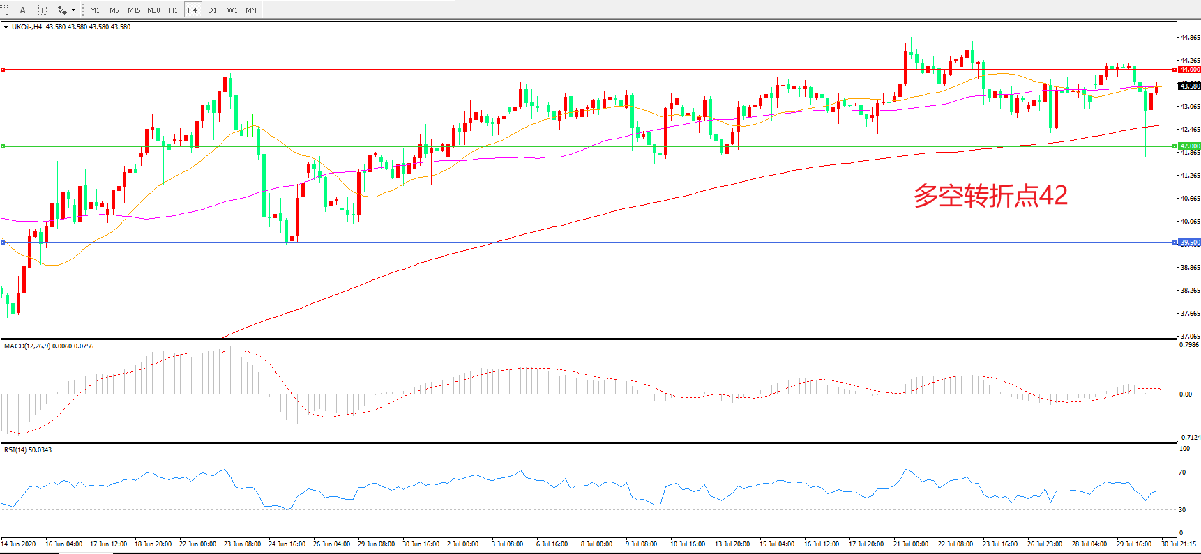 周四(7月30日),资本市场经历连番冲击,美国二季度美国GDP下滑32.9%,创下二战以来最大单季降幅纪录。市场风险情绪受到冲击, 布伦特原油一度跌穿42一线,随后震荡回升,收报43.58美元/桶。