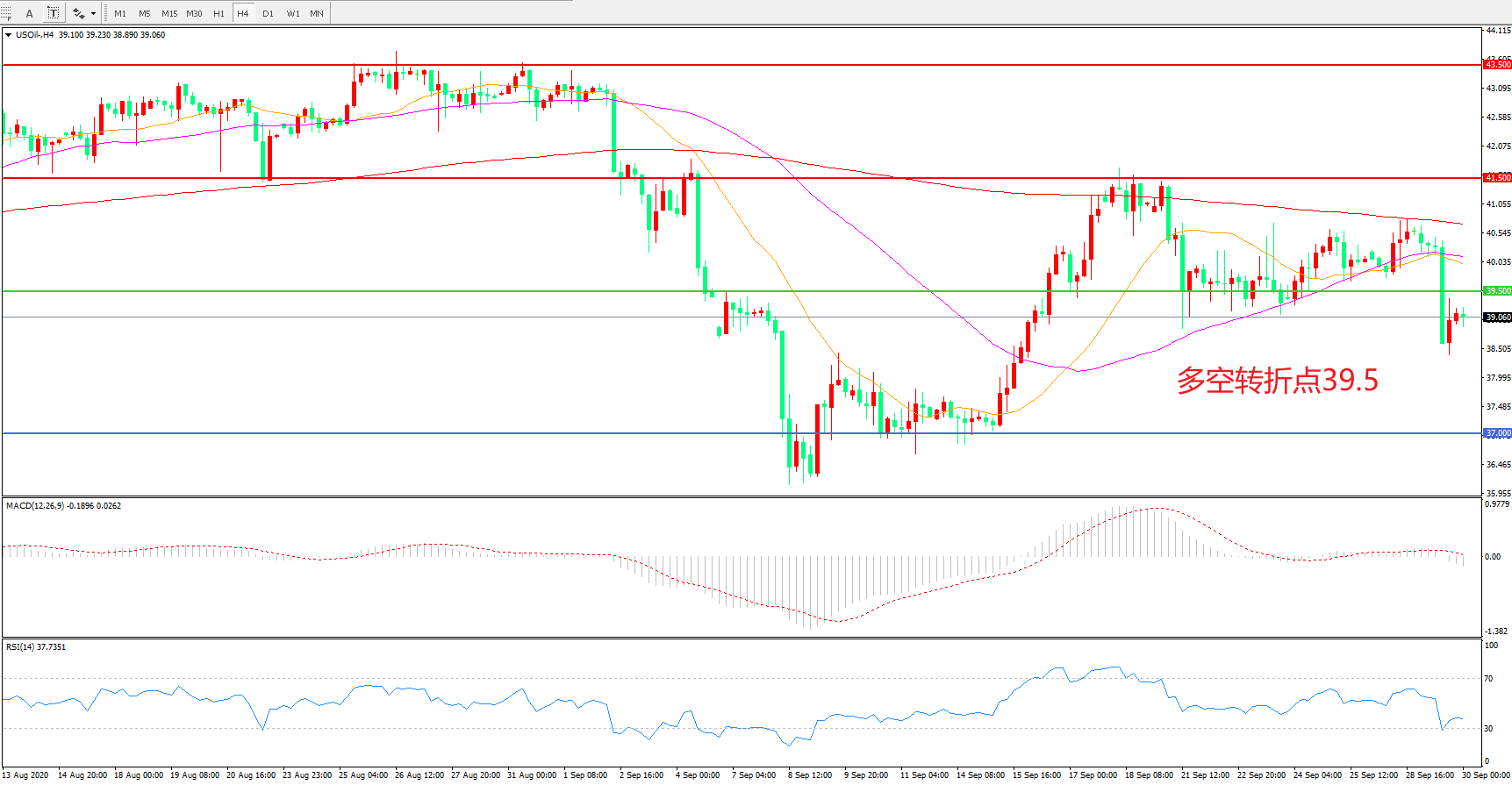 4小时图看,油价长阴下破,短期涨势受挫,39.5再次成为多空分水岭,均线系统走平,MACD绿柱增加,RSI指标走平,日内延续震荡概率较大。