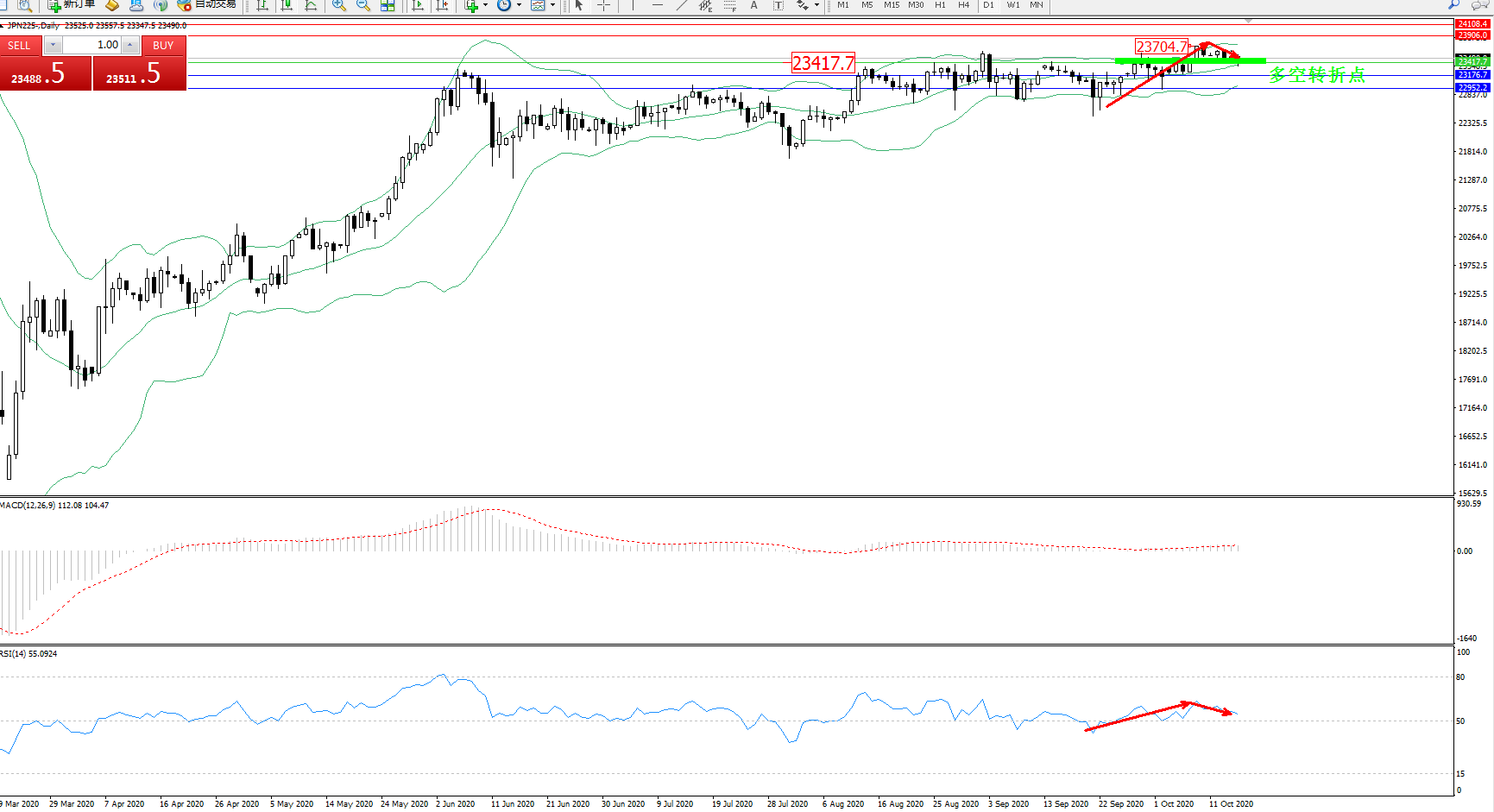 日经225指数10月15日(周四)收盘下跌128.23点,跌幅0.54%,报23498.50点。欧美市场跳水,美国三大股指期货跌幅扩大,纳指期货跌1%,标普500指数期货跌0.55%,道指期货跌0.5%。美国财长未排除11月初之前达成刺激计划的可能,而特朗普力挺“新冠神药” 称年底前疫苗上市,正寻求紧急批准再生元药品。市场参与者,尤其是股票投资者,可能最终会认为美国在未来几周实施财政刺激的可能性会被高估,应该暂时阻止冒险情绪的升温,因为目前市场的积极因素已经耗尽,此外欧洲的新冠情况继续恶化,在美国大选临近之际,不要排除美元出现更为防御性的倾向,为美元提供一些支撑。